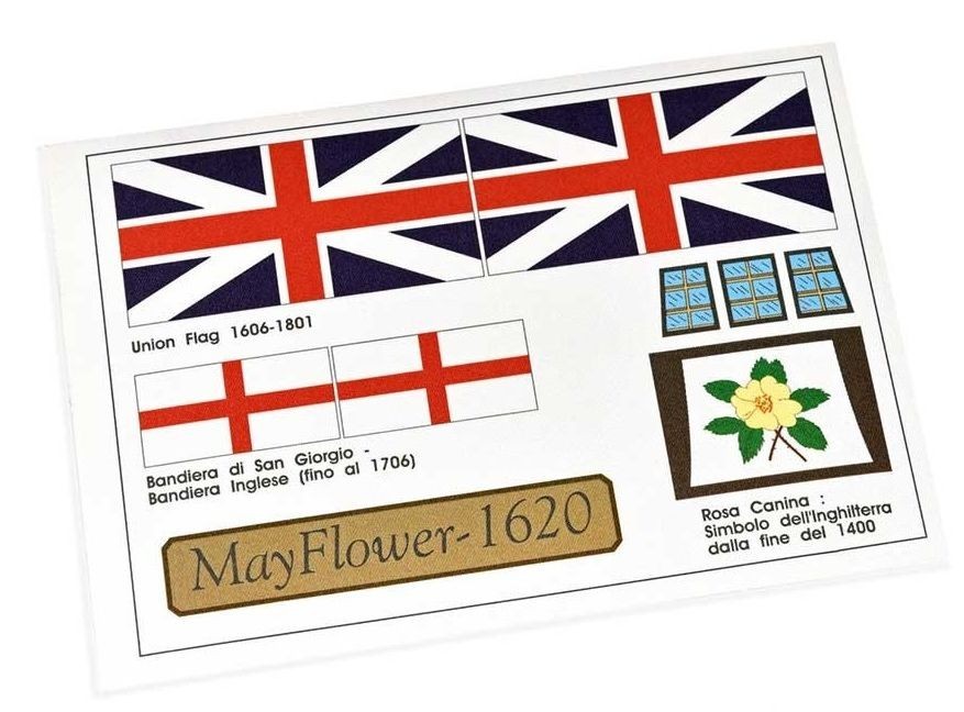Bandery wydrukowane są na specjalnej samoprzylepnej tkaninie. Bandery trzeba symetrycznie złożyć względem osi symetrii którą tworzy flaglinka. Arkusz zawiera 2 różne bandery oraz okna i emblemat z pawęzy statku Mayflower.