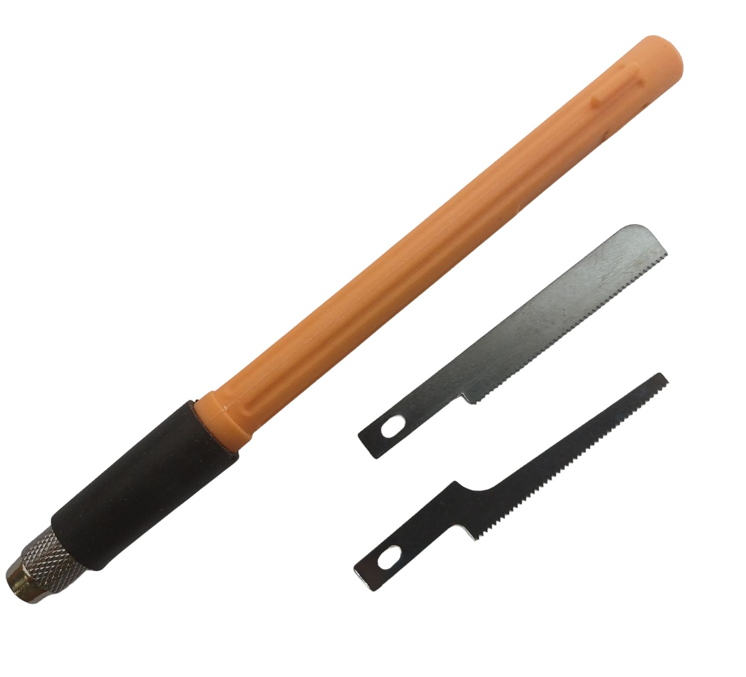 Modeling saw made of plastic and metal. The set includes two types of blades intended, among others, for wood. The length of the handle without saw blades is 15 cm