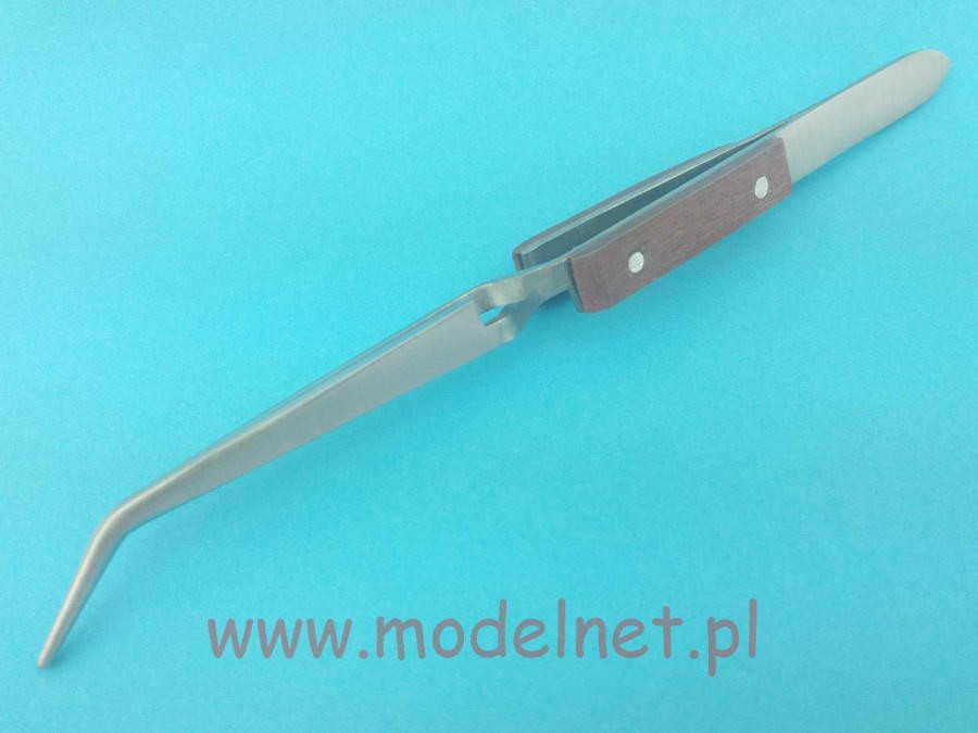 The tweezers distributed by Adammed are made of stainless steel. The tool has a strong self-locking grip and bent tips. Thanks to thermal insulators made of wood, it will be perfect for soldering.