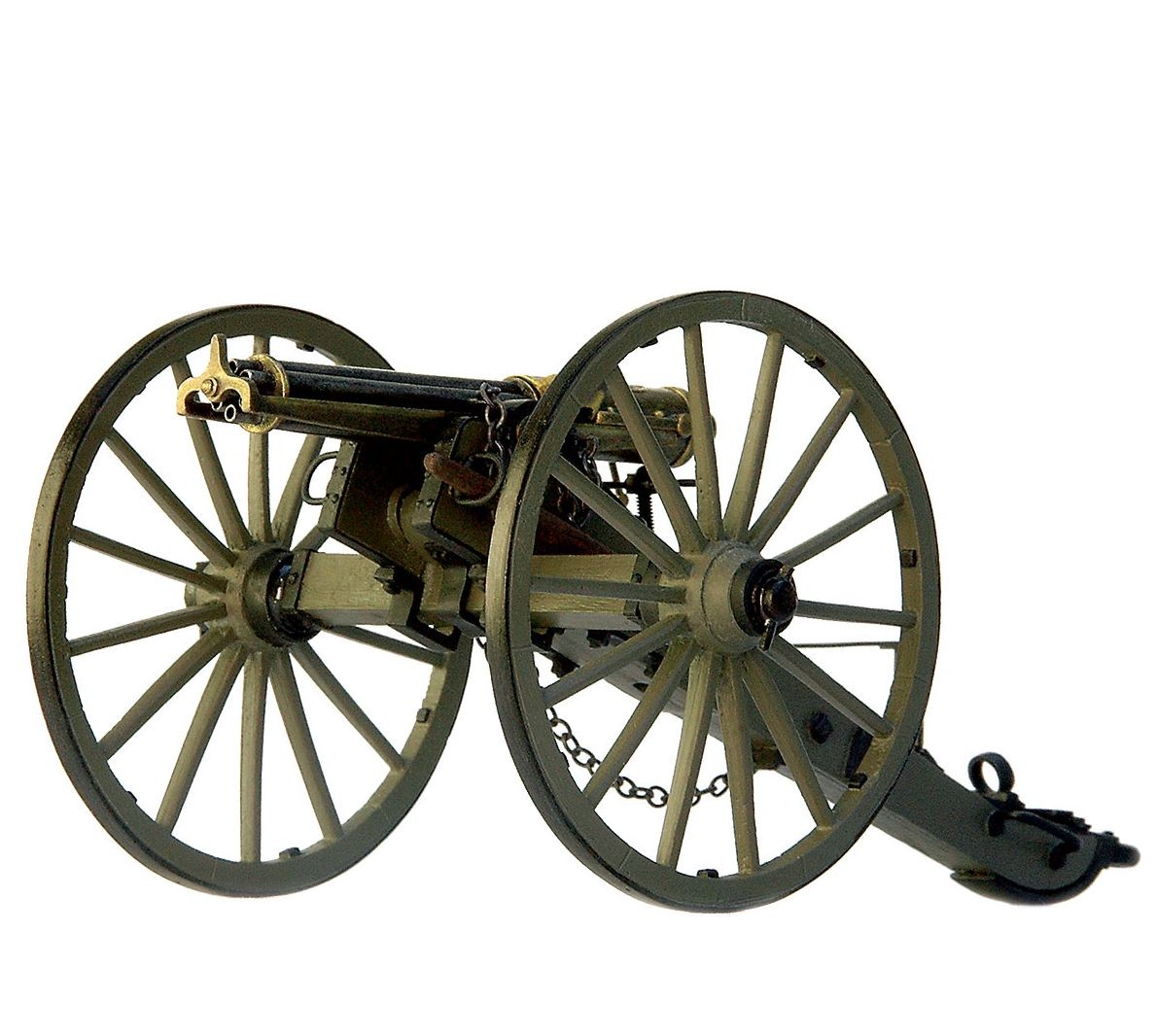 The hand-cranked machine gun was invented in 1861 by Dr. Richard J. Gatling of Hartford County, NC. Over time, 6-barrel and 10-barrel versions were produced in various calibers, including .45, .50 and 1". All were activated by cam-operated bolts that alternately wedged and fired the bullets, then ejected the spent cartridges, allowing each barrel to cool down before it came around to be fired again.