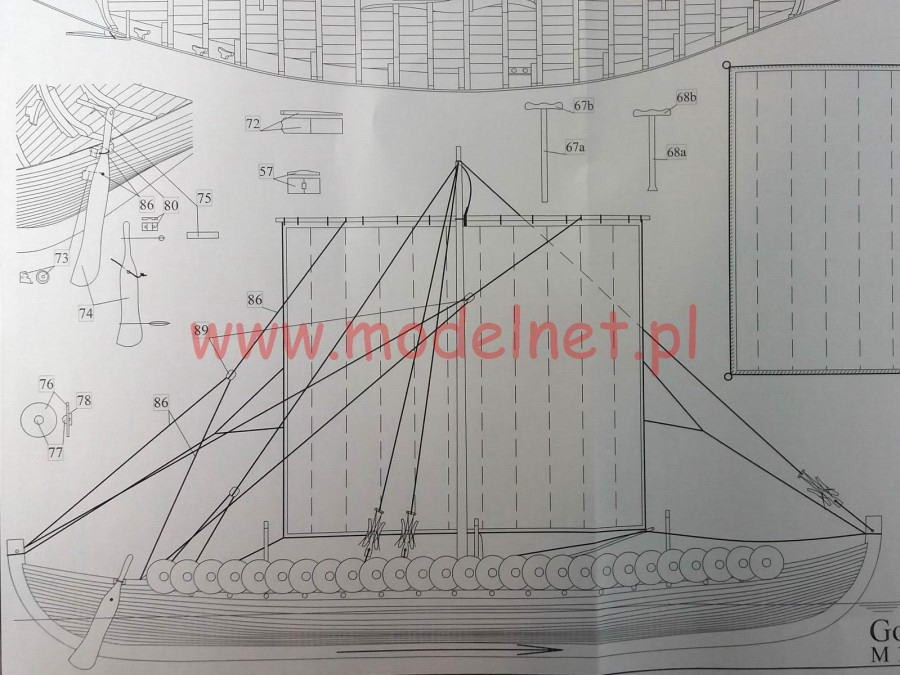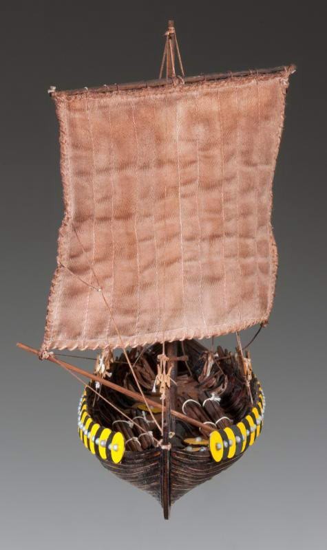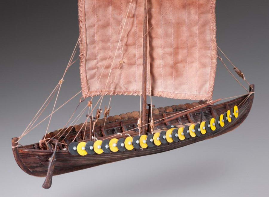 Dusek's Viking boat model is modeled on an archaeological discovery from 1880 near the village of Gokstad in Norway. It was then that a Viking boat, built in the second half of the 9th century, was found. The excellent seamanship of the ship was demonstrated in 1893 when a wooden replica built by Magnus Anderson made a trip from Norway to the USA. The total length of the ship was 24 meters. The keel and boards are made of oak wood. The ship was powered by 32 oars and one rectangular sail.