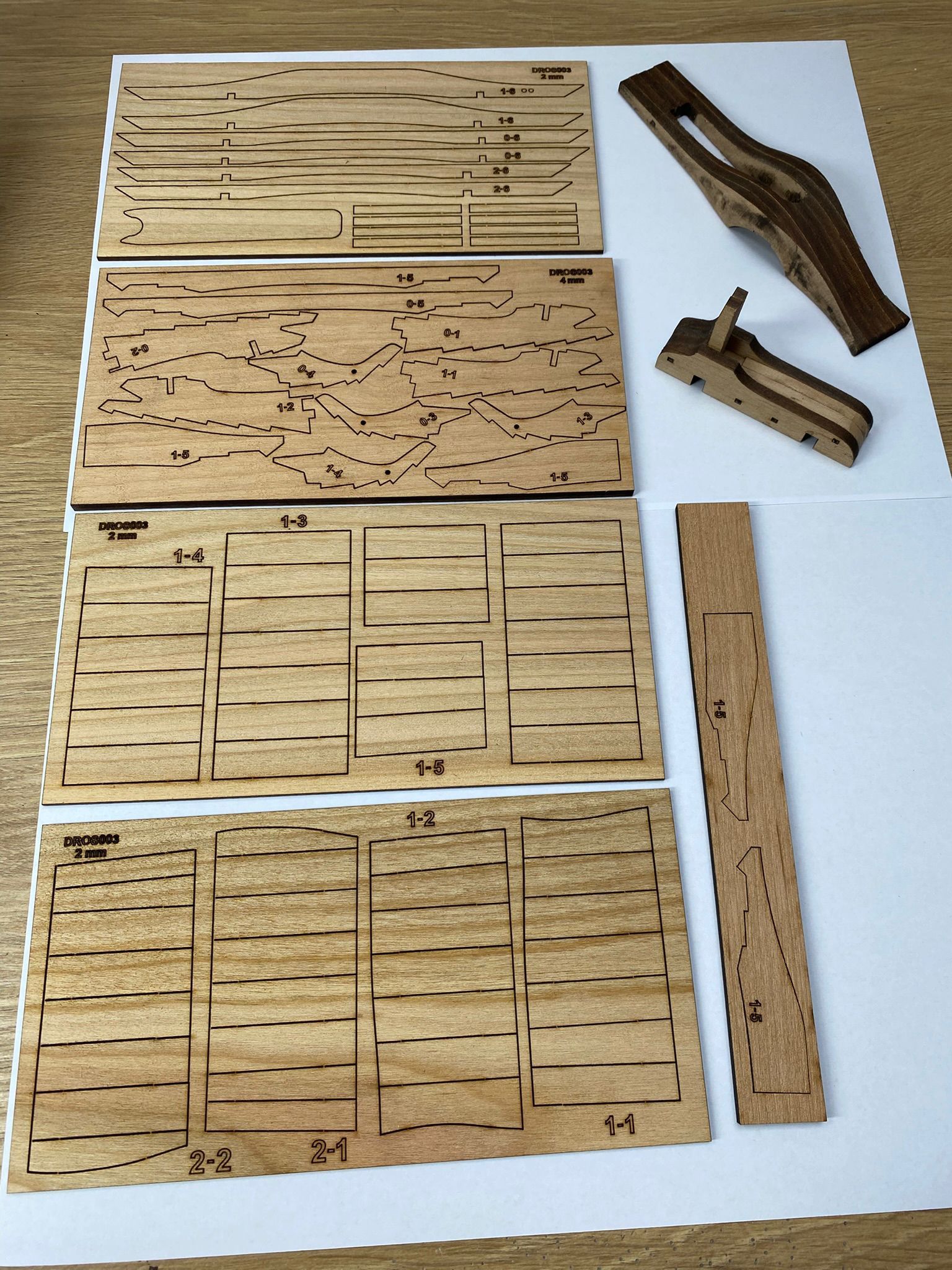 Several Oseberg ship kits have been released on the modeling market, but the model by Ships of Pavel Nikitin is the most faithful reconstruction. It was prepared based on the latest scientific findings. The box contains over 1,900 laser-cut parts, mostly from solid wood. The individual planks of the planking were cut separately, as were the deck planks. Additionally, the kit includes a sail and rigging, anchors, and a 3D-printed replica of a cauldron.