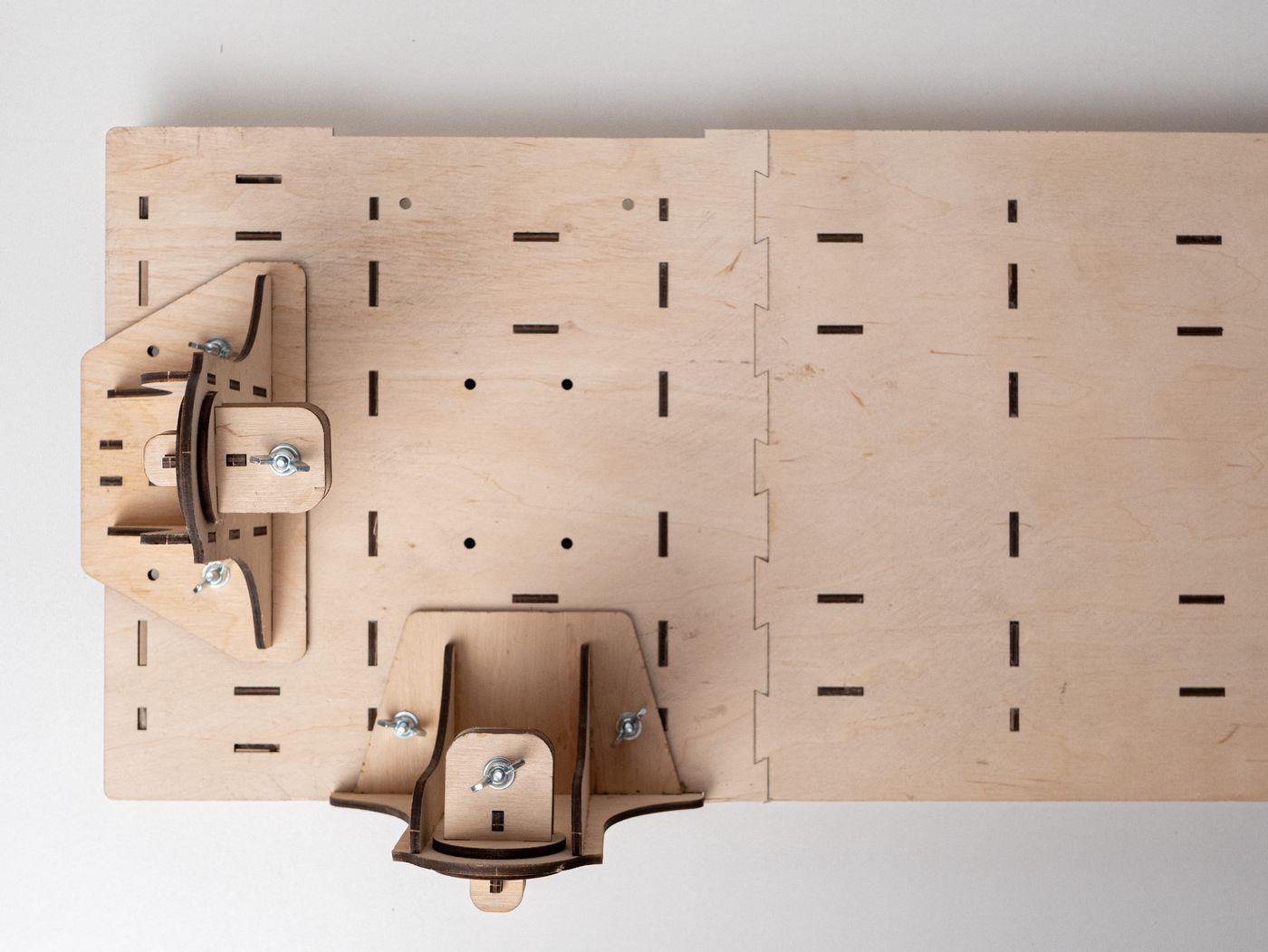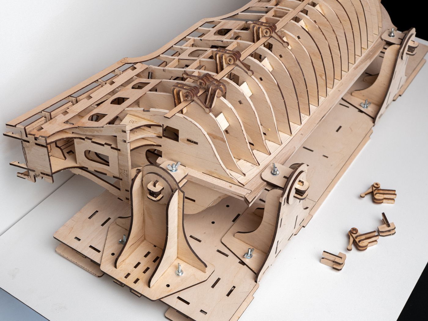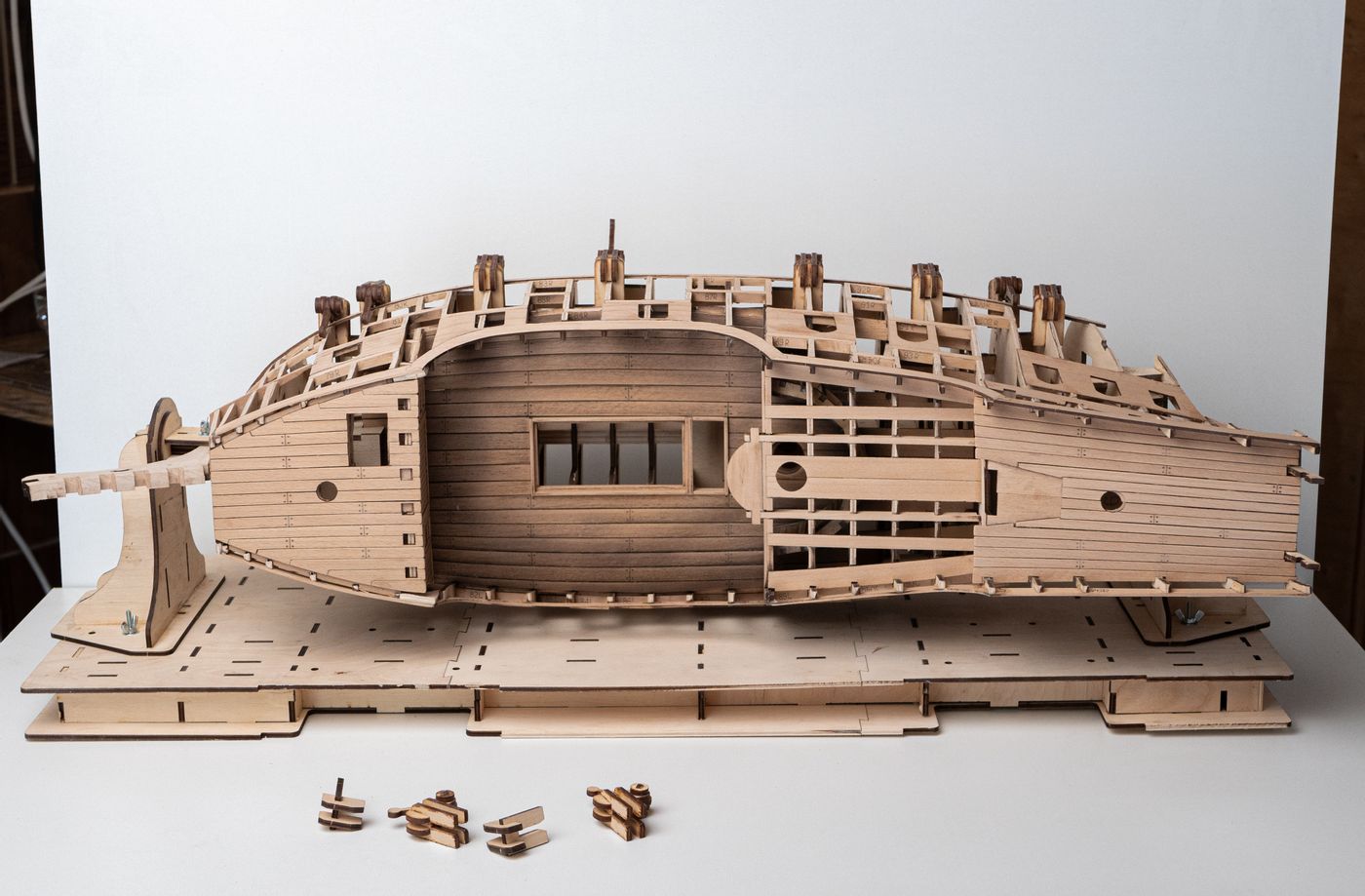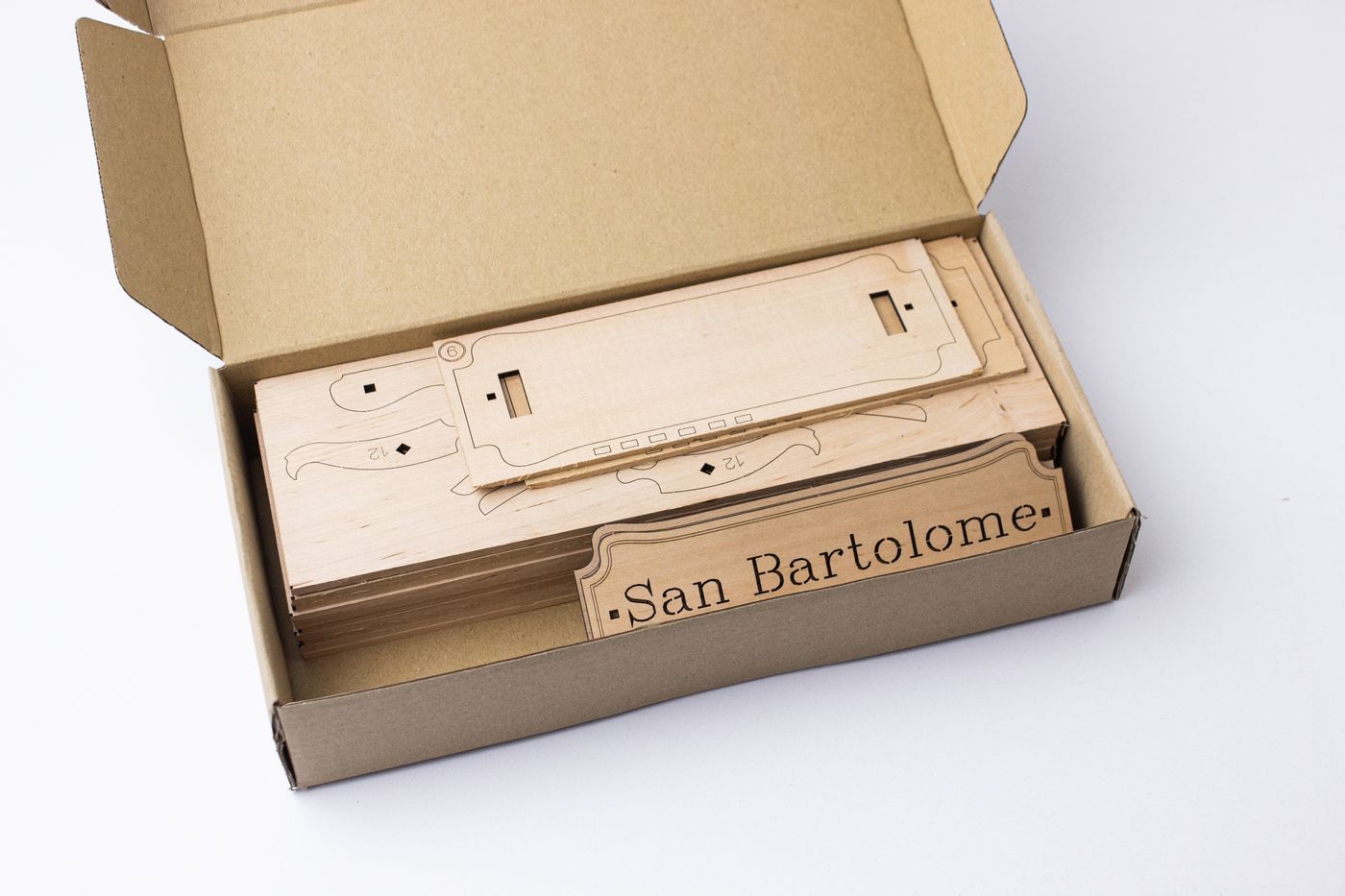 The kit includes a slipway intended to facilitate “San Bartolome 2” outer decks assembly process. Slipway construction allows to fix the body and can be turned 90 degrees in a longitudinal plane to the left/right sides and fix outer decks below the waterline. All details are laser cut. Manual included for easy assembly. Packed kit size: 310x320x65 mm.