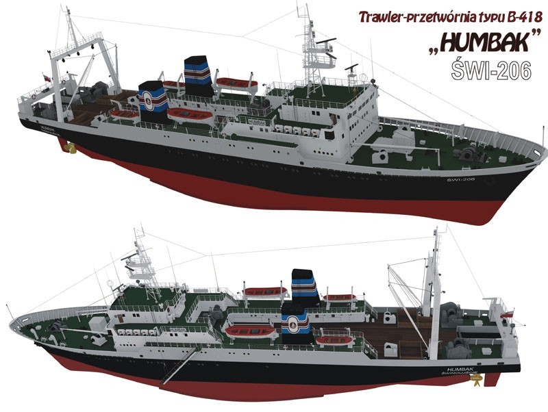 - Plany modelarskie w skali 1:150 (część pierwsza) oraz model 3D trawlera-przetwórni typu B-418 "HUMBAK" ŚWI-206.