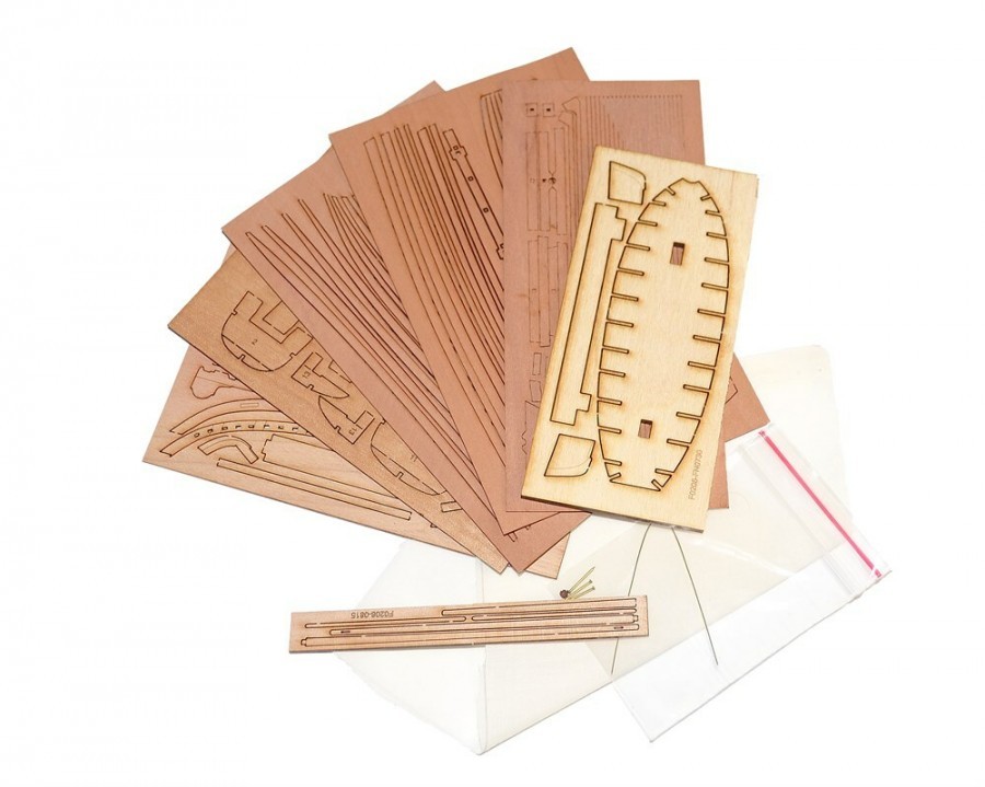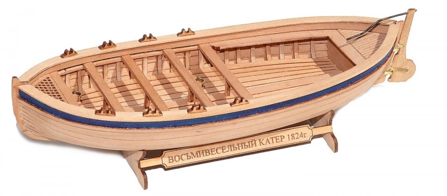 Model wiosłowej łodzi typu welbot datowany na 1824 rok. Zestaw wycinany laserowo z drewna gruszy. Zawiera figurkę.