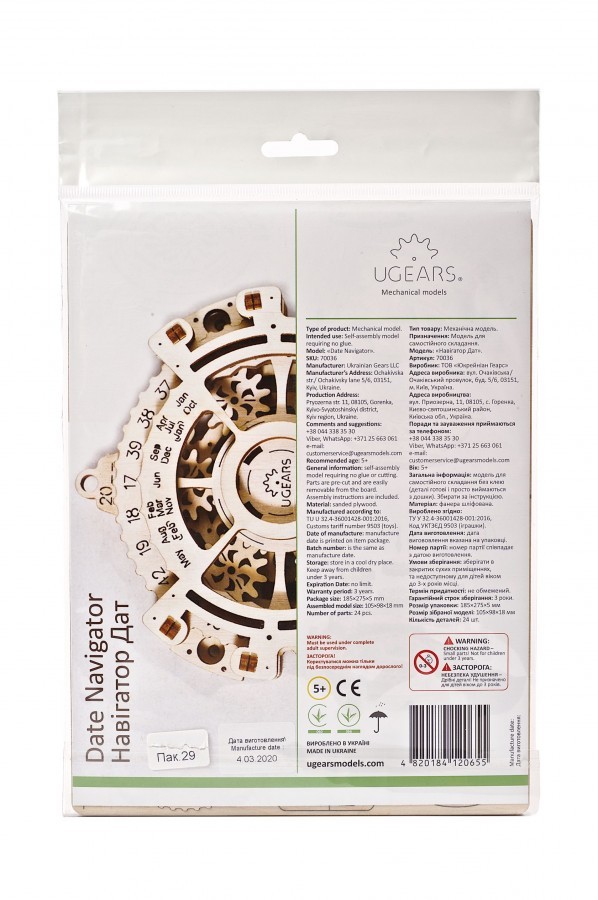 Nawigator daty pomaga w identyfikacji dnia tygodnia na dowolny dzień od 2017 do 2044. Jak wszystkie modele UGEARS, Nawigator daty montuje się bez kleju.