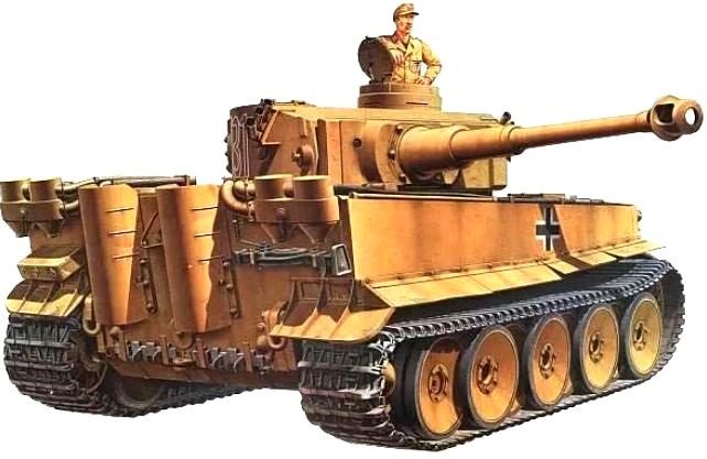 Czołgi ciężkie Tiger produkowane były w latach 1942 -1944 w zakładach Henschel Und Sohn w Kassel. Dane: długość 8,45 m, szerokość 3,7 m, wysokość 2,93 m, masa całkowita 57 ton, trakcja gąsienicowa. Napęd silnik benzynowy dwunasto-cylindrowy V o mocy 700 KM, prędkość na drodze 38 km/h. Załoga pięciu żołnierzy. Uzbrojenie podstawowej wersji: armata 88 mm, trzy karabiny maszynowe 7,92 mm. Opancerzenie od 120 do 25 mm. W ciągu dwóch lat wyprodukowano 1355 tych czołgów. Bazując na doświadczeniach załóg czołgi te były stale modernizowane.