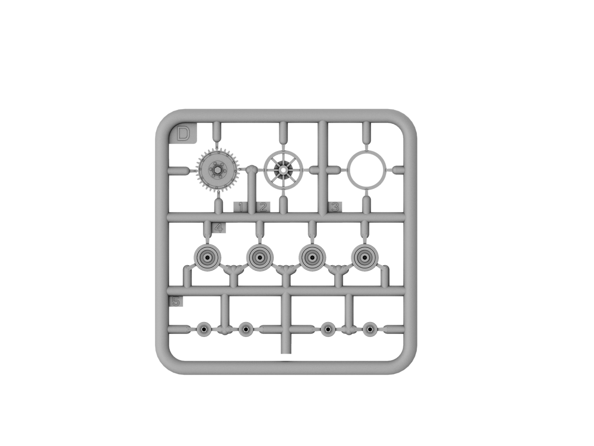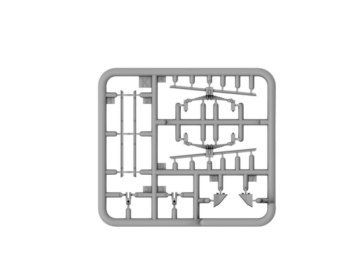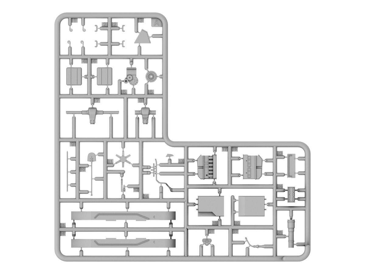 Model plastikowy do sklejania zawiera wszystkie elementy potrzebne do budowy modelu, w tym m.in.: