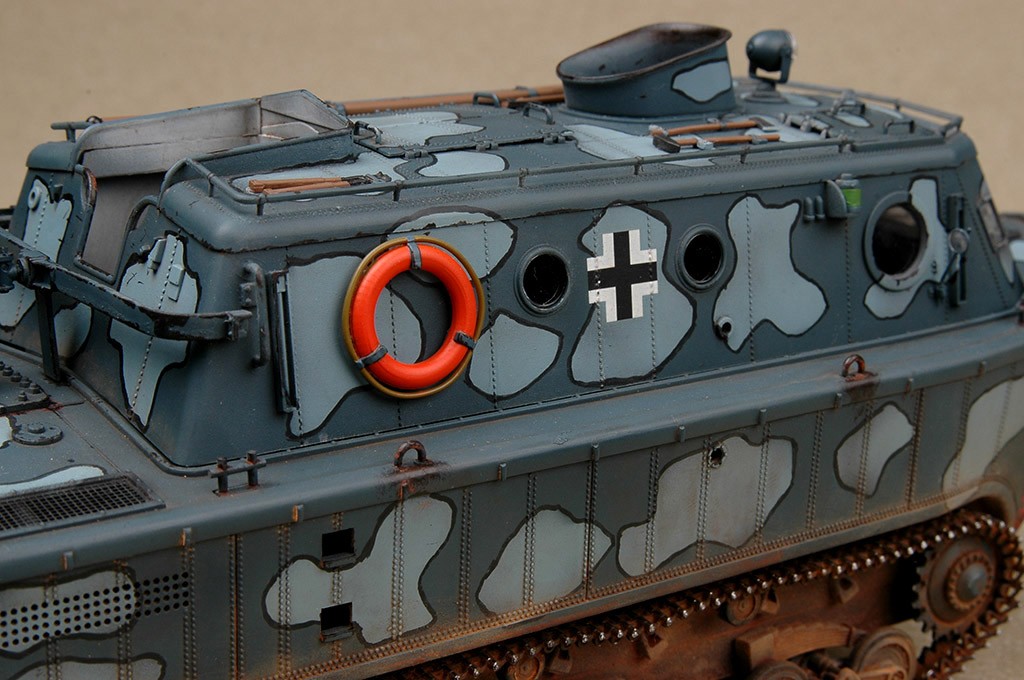Amfibia gąsienicowa LWS (Landwasserschlepper) była niemieckim ciągnikiem zaprojektowanym w 1935 roku w zakładach Rheinmetall –Borsig w Dűsseldorf. Produkcję rozpoczęto dopiero w 1940 roku. W sumie wyprodukowano niespełna 100 egzemplarzy tych pojazdów. Jeżeli ktoś widział film „Bitwa o Anglię” z 1969 roku, to pamięta sceny z przygotowań Niemców do inwazji. Widać było niemieckie środki transportowe zgromadzone na wybrzeżu Calais, gdzie między innymi znajdowały się amfibie gąsienicowe LWS. Amfibię napędzał silnik benzynowy o mocy 300 KM. Szybkość na drodze do 35 km/h, na wodzie do 12 km/h. Załoga 2 osoby, amfibia mogła transportować 20 żołnierzy. Była nieuzbrojona. Amfibie LWS miały być używane do wyciągania na brzeg barek szturmowych bez napędu podczas inwazji oraz do holowania pojazdów po plażach. Były również używane do przewożenia zapasów bezpośrednio na brzeg podczas sześciu godzin odpływu, kiedy barki były uziemione. Wiązało się to z holowaniem przyczepy amfibii Kässbohrer (zdolnej do transportu 10-20 ton ładunku) za LWS. Niewielka liczba tych pojazdów była używana do końca wojny.