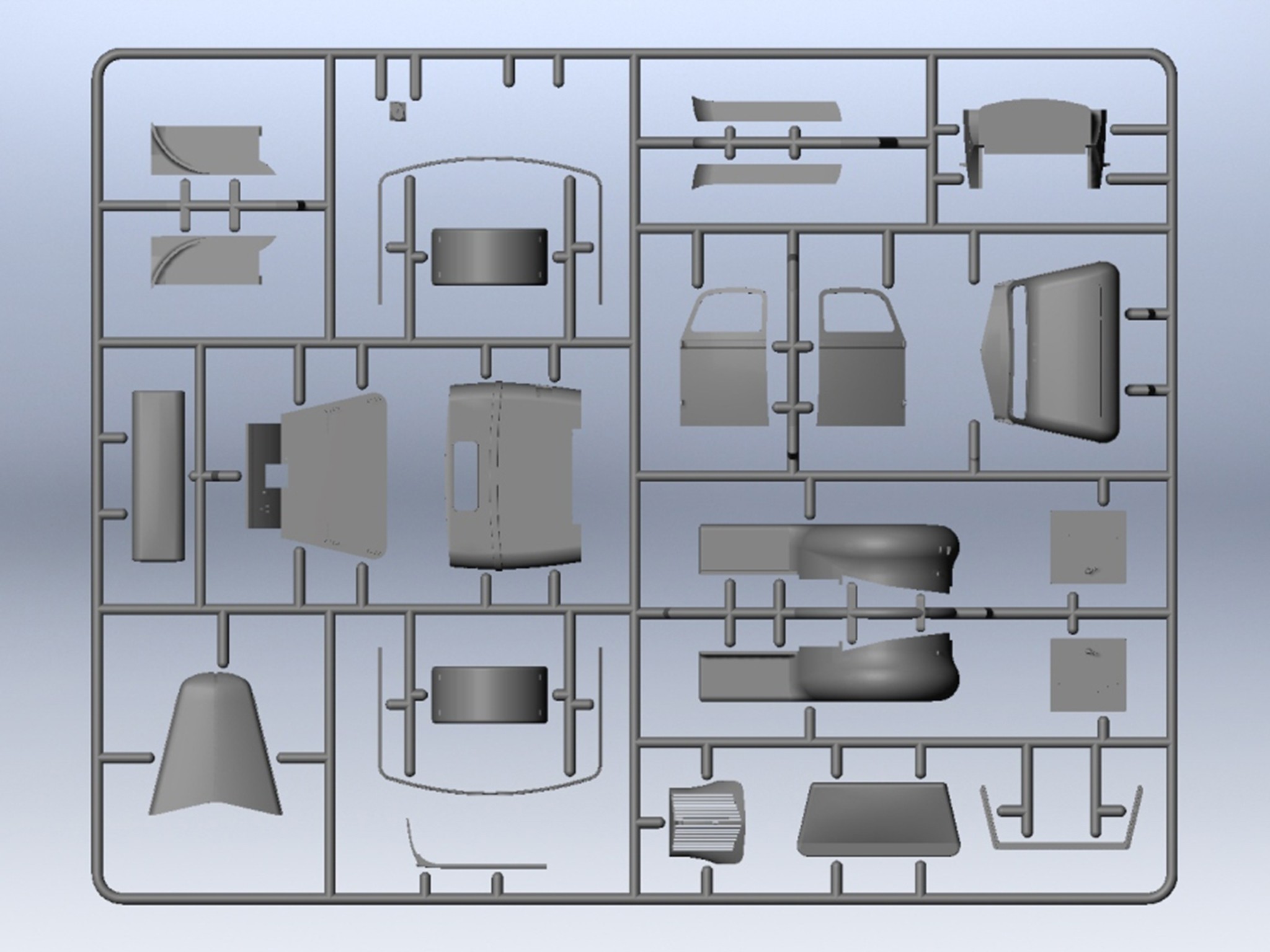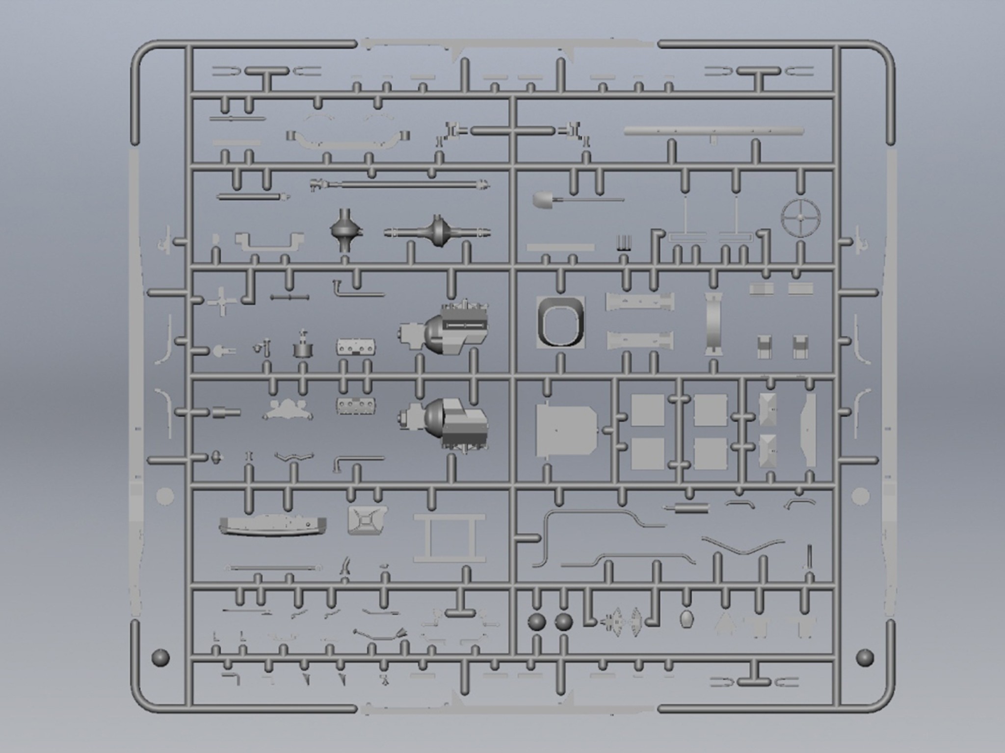 Model plastikowy do sklejania zawiera wszystkie elementy potrzebne do budowy modelu, w tym m.in.: