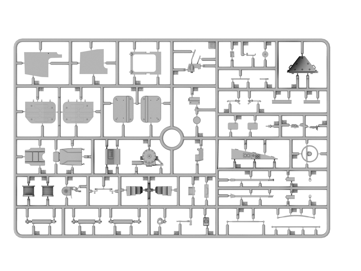 Model plastikowy do sklejania zawiera wszystkie elementy potrzebne do budowy modelu, w tym m.in.: