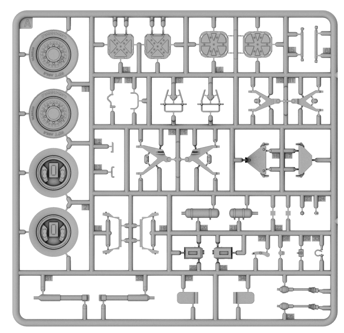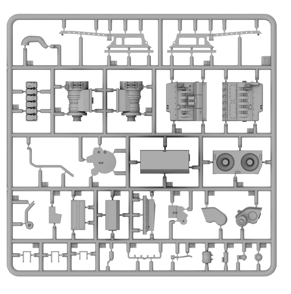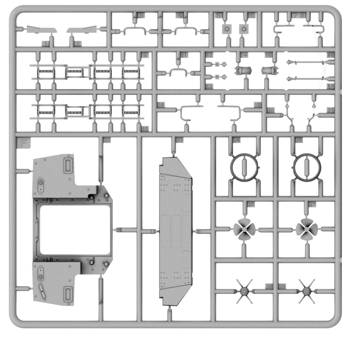 Model plastikowy do sklejania zawiera wszystkie elementy potrzebne do budowy modelu, w tym m.in.: