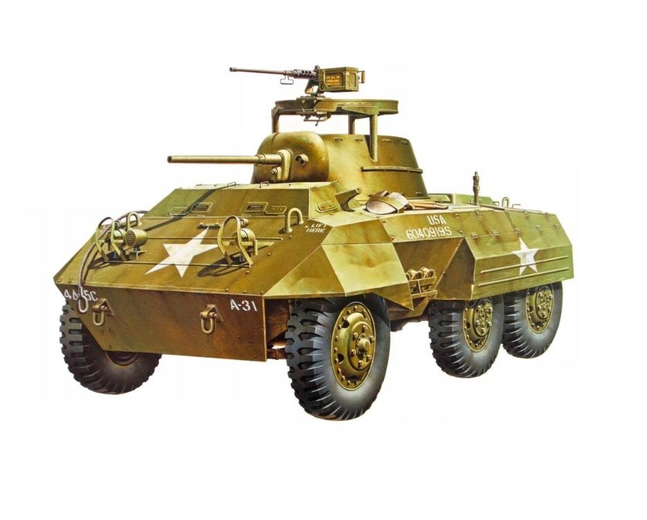 Amerykański 6 -kołowy samochód pancerny M8 projektowany był jako niszczyciel czołgów w 1941 roku, jednak jak wykazały testy do tego celu był zbyt słabo uzbrojony (armata ppanc 37 mm) i nie był w stanie zagrozić czołgom będącym wtedy na uzbrojeniu wrogich armii. Doskonała mobilność drogowa M8 uczyniła go doskonałym elementem wsparcia nacierających amerykańskich i brytyjskich kolumn pancernych. W latach 1943 -1945 wyprodukowano prawie 8500 tych pojazdów. Używany był w czasie II wojny światowej w armiach USA i brytyjskiej. W brytyjskiej służbie M8 był znany jako „Greyhound” (chart). Armia brytyjska uznała, że jest on zbyt słabo opancerzony, szczególnie podłoga kadłuba, przez którą miny przeciwpancerne mogły z łatwością przebić (rozwiązanie załogi polegało na wyłożeniu podłogi przedziału załogi workami z piaskiem. M8 napędzany był silnikiem benzynowym o mocy 110 KM, osiągał prędkość na drodze niemal 90 km/h, załoga: 4 osoby, opancerzenie: do 19 mm, uzbrojenie: armata ppanc 37 mm, wielkokalibrowy karabin maszynowy 12,7 mm i karabin maszynowy 7,62 mm. M8 wszedł do służby bojowej u aliantów podczas inwazji na Sycylię w 1943 roku. Był używany przez armię amerykańską we Włoszech, Europie północno-zachodniej i na Pacyfiku. W tym ostatnim przypadku był używany głównie na Okinawie i Filipinach, a nawet był używany w swojej pierwotnej roli niszczyciela czołgów, ponieważ większość japońskich czołgów miała pancerz wrażliwy na działanie działa kal. 37 mm. Ponad 1000 M8 dostarczono sojusznikom USA w ramach Lend-Lease; Wielkiej Brytanii, Wolnej Francji i Brazylii. Po wojnie wiele samochodów opancerzonych M8 armii amerykańskiej oznaczono jako nadwyżki i podarowano lub sprzedano różnym krajom, zwłaszcza w ramach Programu Pomocy Zagranicznej Wojskowej. Większość pozostałych pojazdów pozostała w służbie w policji w różnych krajach Europy Zachodniej. Obecnie wiele z nich są eksponatami w muzeach broni pancernej w tym w Muzeum Pancernym w Kłaninie.