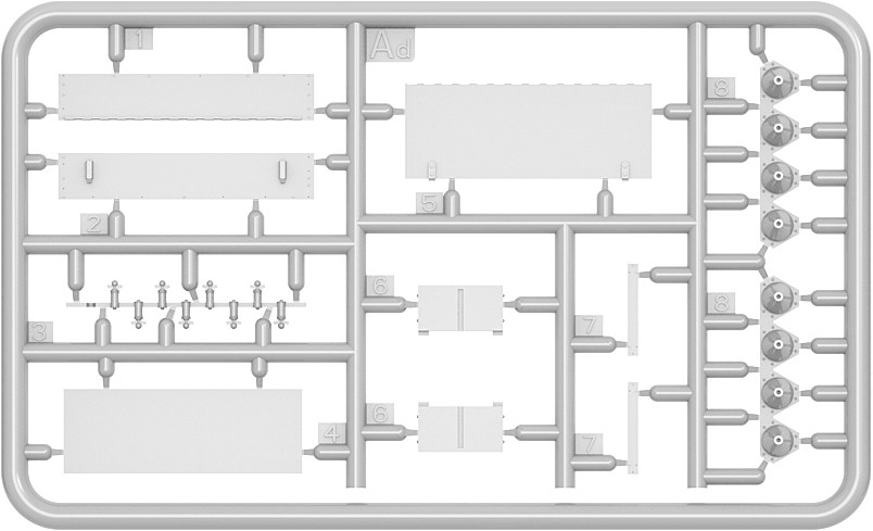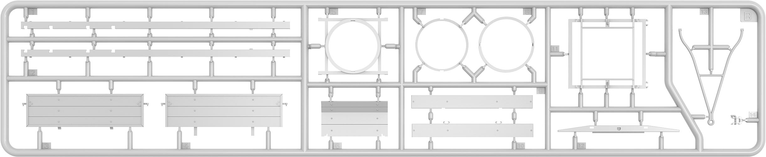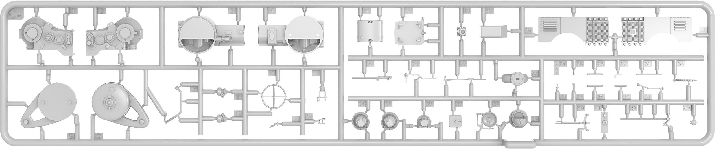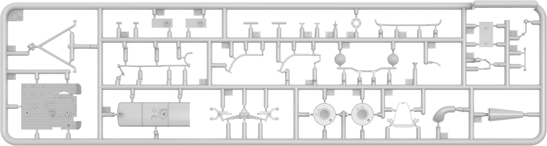 Model plastikowy do sklejania zawiera wszystkie elementy potrzebne do budowy modelu, w tym m.in.: