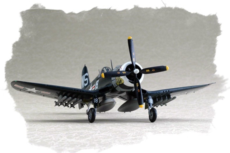 Jednomiejscowy myśliwiec bombardujący lotnictwa US Navy Corsair F4U produkowany był w latach 1942 -1953 w zakładach Vought –Sikorsky Aircraft w Connecticut w USA. Później ze względu na duże zapotrzebowanie US Navy w czasie wojny i potrzeby eksportowe produkowany był też przez zakłady Goodyear (wersja FG) i Brewster (wersja F3A). Corsair miał charakterystyczną sylwetkę, zawdzięczał to „łamanym” skrzydłom jak litera W. Napędzany był silnikiem o mocy 2300 KM pozwalającym na osiągnięcie szybkości 718 km/h na pułapie 6000 m. Uzbrojenie: pierwsze wersje 6 karabinów maszynowych 12,7 mm (potem zastąpionych przez 4 działka 20 mm), ponadto mógł przenosić 2 bomby 450 kg każda lub 8 pocisków kierowanych Hvar 127 mm. W USA służył do 1953 roku. Corsairy służyły w 7 armiach, w tym w Europie: we Francji i Wielkiej Brytanii. W Europie wycofano je ze służby w 1960 roku, a w Ameryce południowej walczyły nawet przeciwko sobie w wojnie futbolowej między Hondurasem i Salwadorem w 1969 roku. Brytyjskie Corsairy brały udział jako ochrona bombowców między innymi w skutecznym ataku w norweskim fiordzie na pancernik Tirpitz. Wychodziły zwycięsko w walce z japońskimi myśliwcami w walkach na Pacyfiku. Brały też udział w wojnie w Korei w latach 1950 -1953 . Generalna opinia jest taka, że Corsair był najlepszym myśliwcem w swojej klasie w czasie II wojny światowej. Dopiero wprowadzany już po wojnie napęd odrzutowy zmusił ten samolot do zejścia ze sceny.