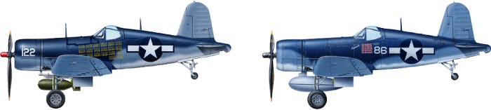 Jednomiejscowy myśliwiec bombardujący lotnictwa US Navy Corsair F4U produkowany był w latach 1942 -1953 w zakładach Vought –Sikorsky Aircraft w Connecticut w USA. Później ze względu na duże zapotrzebowanie US Navy w czasie wojny i potrzeby eksportowe produkowany był też przez zakłady Goodyear (wersja FG) i Brewster (wersja F3A). Corsair miał charakterystyczną sylwetkę, zawdzięczał to „łamanym” skrzydłom jak litera W. Napędzany był silnikiem o mocy 2300 KM pozwalającym na osiągnięcie szybkości 718 km/h na pułapie 6000 m. Uzbrojenie: pierwsze wersje 6 karabinów maszynowych 12,7 mm (potem zastąpionych przez 4 działka 20 mm), ponadto mógł przenosić 2 bomby 450 kg każda lub 8 pocisków kierowanych Hvar 127 mm. W USA służył do 1953 roku. Corsairy służyły w 7 armiach, w tym w Europie: we Francji i Wielkiej Brytanii. W Europie wycofano je ze służby w 1960 roku, a w Ameryce południowej walczyły nawet przeciwko sobie w wojnie futbolowej między Hondurasem i Salwadorem w 1969 roku. Brytyjskie Corsairy brały udział jako ochrona bombowców między innymi w skutecznym ataku w norweskim fiordzie na pancernik Tirpitz. Wychodziły zwycięsko w walce z japońskimi myśliwcami w walkach na Pacyfiku. Brały też udział w wojnie w Korei w latach 1950 -1953 . Generalna opinia jest taka, że Corsair był najlepszym myśliwcem w swojej klasie w czasie II wojny światowej. Dopiero wprowadzany już po wojnie napęd odrzutowy zmusił ten samolot do zejścia ze sceny.