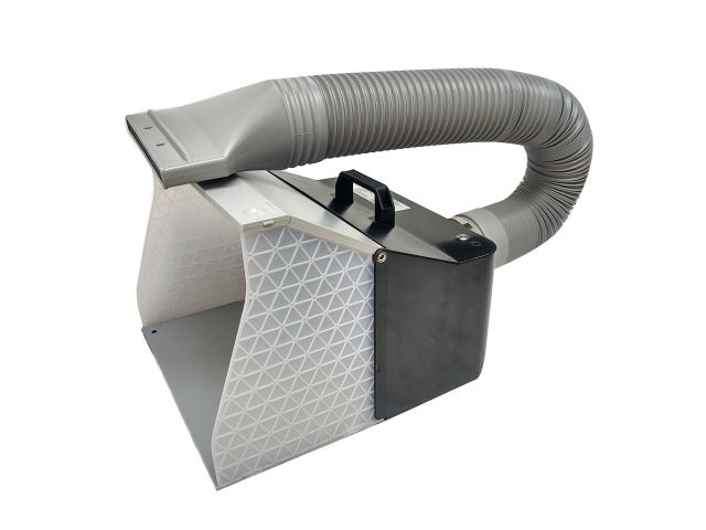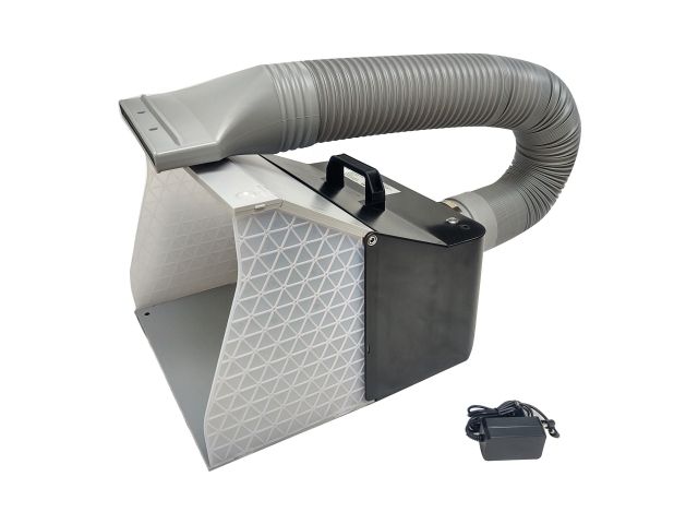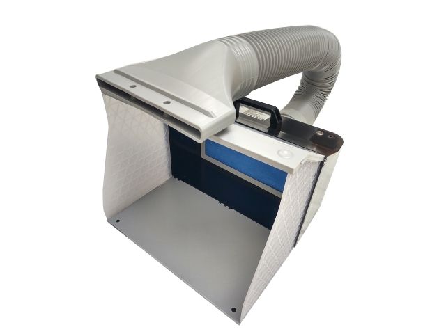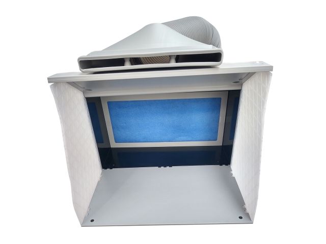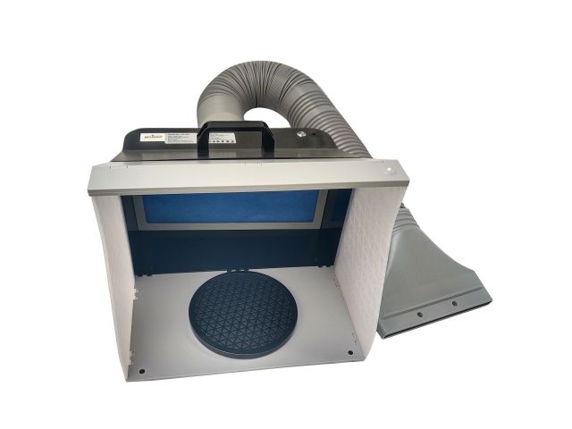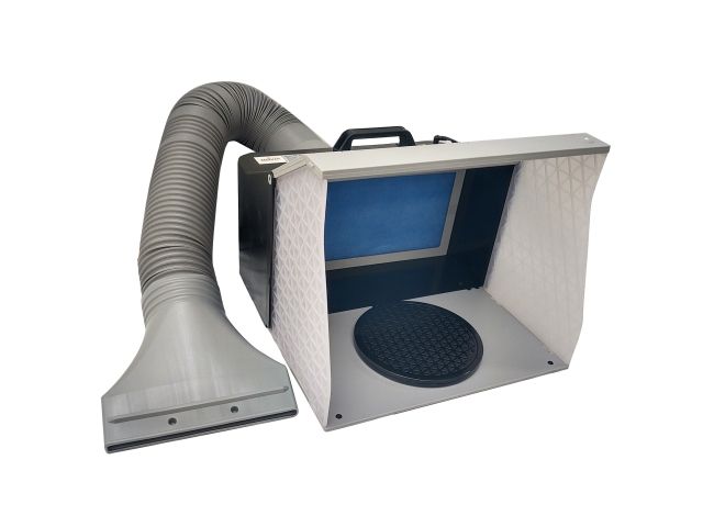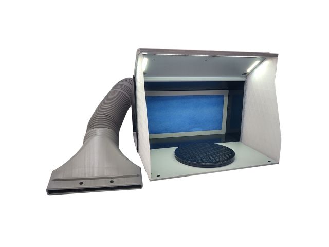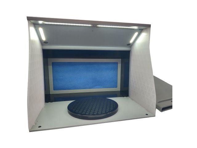 Składana kabina malarska do malowania modeli aerografem. Kabina wyposażana jest w filtry i dwa wentylatory oraz oświetlenie LED. Urządzenie posiada obrotowy talerz aby ułatwiać prace przy malowaniu detali. Wentylator wbudowany w tył kabiny pozwala na odprowadzenie mgły powstałej podczas malowania do rury o długości 1,7m znajdującej się w zestawie. Rurę można z powodzeniem wpiąć do przystosowanych otworów wentylacyjnych.