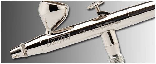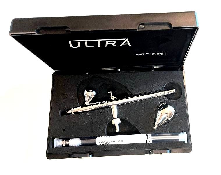 Konstrukcja aerografu Ultra jest bardzo prosta, ilość elementów ruchomych jest ograniczona do minimum. Nie ma tu regulacji plamki maksymalnej czy ciśnienia. Jedyny element regulacyjny to spust, nim kontrolujemy ilości farby i powietrza, co sprawia że jest to niezawodna prosta konstrukcja.