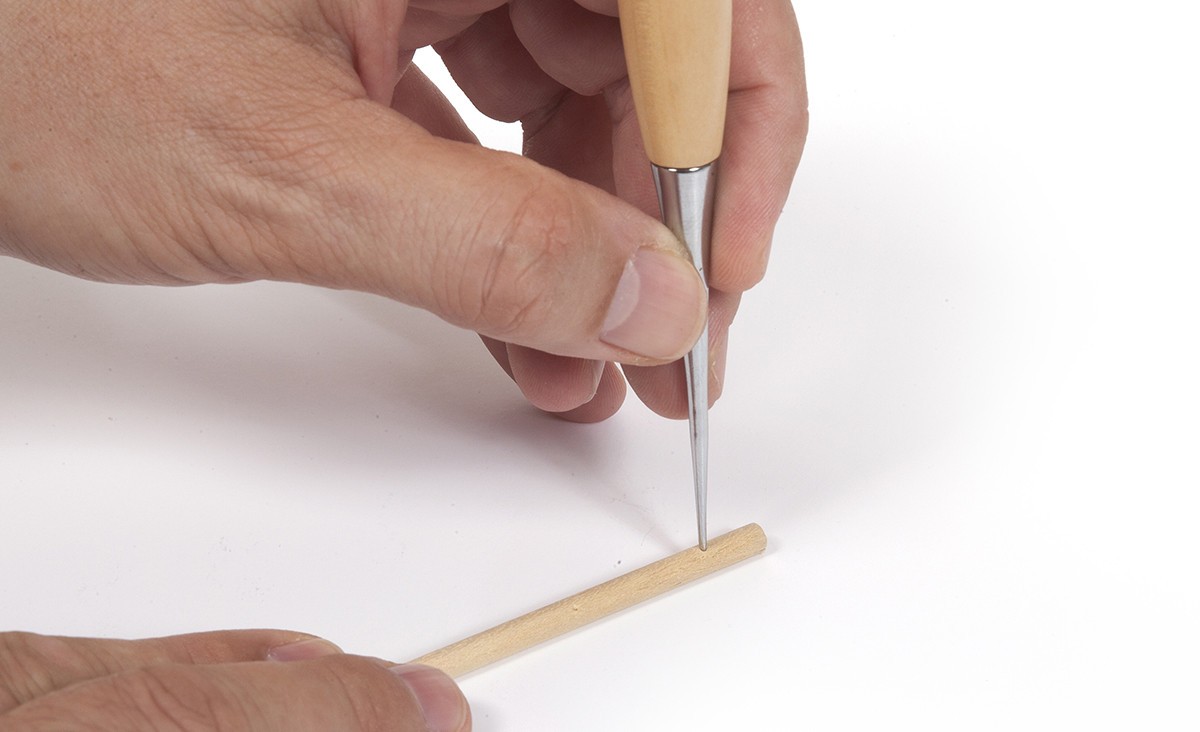 Mini szpikulec metalowy z drewnianą rączką.  Przydatny przy wielu pracach modelarskich. Długość całkowita narzędzia wynosi około 12 cm.