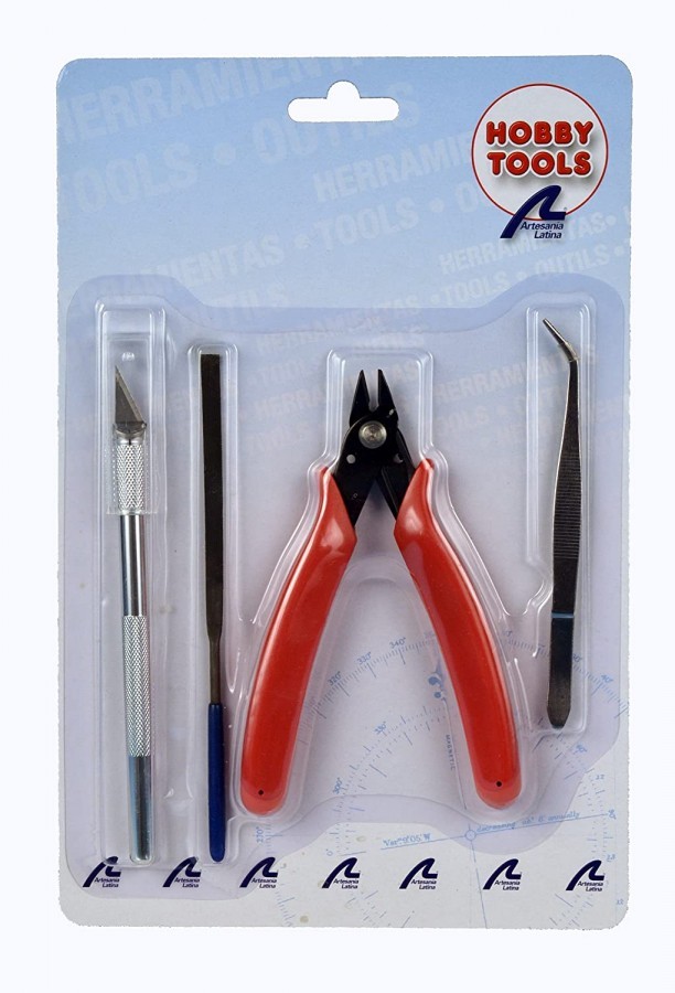 Zestaw wybranych narzędzi używanych przy budowaniu modeli z drewna.Zestaw zawiera: