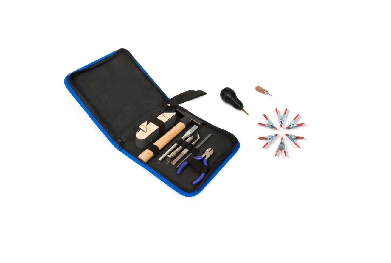 Zestaw podstawowych narzędzi używanych przy budowaniu modeli z drewna.