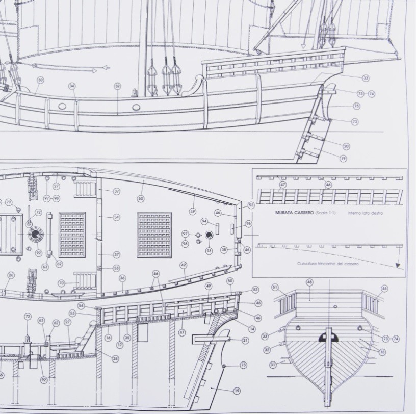 Drukowane plany modelarskie do samodzielnego wykonania modelu statku. Plany pierwotnie były zawartością zestawu i nie posiadają m.in. klasycznego owręża tylko już wyrysowane elementy do wycięcia ze sklejki. Plany są w j. angielskim lub/i włoskim.