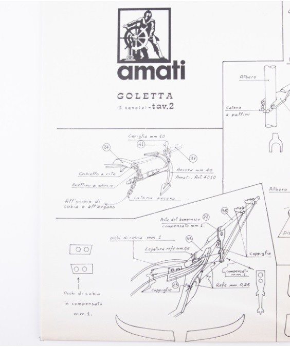 Drukowane plany modelarskie do samodzielnego wykonania modelu statku. Plany pierwotnie były zawartością zestawu i nie posiadają m.in. klasycznego owręża tylko już wyrysowane elementy do wycięcia ze sklejki. Plany są w j. angielskim lub/i włoskim.